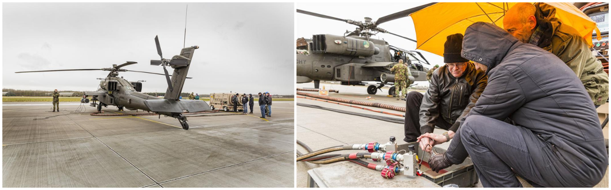Speciaal uit Amerika overgekomen Boeing engineers hielden de test scherp in de gaten en controleerden of de MFAGE-LM voldoet aan alle Boeing-voorwaarden. Testvlieger majoor Harm Cazemier had er alle vertrouwen in, ook omdat het volledige testprogramma minutieus met Boeing en Bureau Typemanagement Apache van de DMO was doorlopen. En hij kreeg gelijk; op het einde van de dag waren alle testen succesvol doorlopen. Na goedkeuring van Boeing wordt de MFAGE-LM binnenkort opgenomen in de Apache GSE Catalogus wat ongetwijfeld een boost betekent voor de Nederlandse industrie. De KLu bekijkt of het 301 Squadron de komende jaren een MFAGE-LM in gebruik krijgt. De test was een initiatief van Business Development van Staf CLSK. Foto’s: KLu