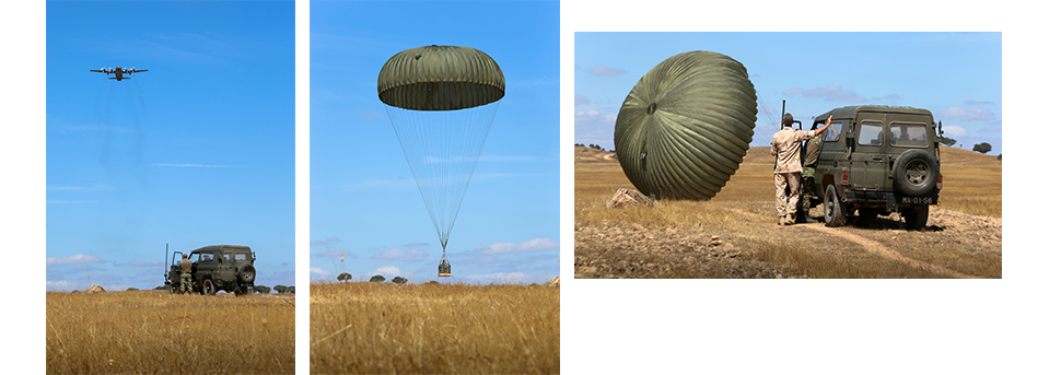 Groene rook: groen licht. Laag en traag komt de C-130 over. 130 knopen bij een hoogte van 600 voet. 240 kilometer per uur, op minder dan 200 meter hoogte. Darryls collega majoor Marcel trekt de neus van de Hercules iets omhoog. ‘Loadie’ Marcel snijdt de spanband door. Eén voor één glijden de ladingen naar buiten. Parachutes ploppen open. Al komt 1600 kilo dan nog heel snel naar de grond. DOEF! DOEF! DOEF! DOEF! Aan het ritme van de dreunen hoort pathfinder Sanch al dat het een goede drop is. Oftewel: vloeiend uit de kist en allemaal binnen 100 meter van het markeringspunt. De C-130 cirkelt terug, want ook de bemanning is benieuwd naar de score. Vleugelwiegend dankt de Hercules de Portugese collega’s op de grond: obrigado!