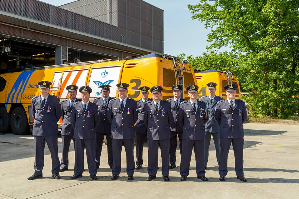11 medewerkers van de brandweer vliegbasis Volkel ontvingen onlangs een medaille voor hun jarenlange dienstverband. Chef-staf luitenant-kolonel Bibi Schmitz speldde het eremetaal op. Enkelen kregen een onderscheiding voor het 12,5 jarig dienstverband, anderen voor 35 jaar trouwe dienst.