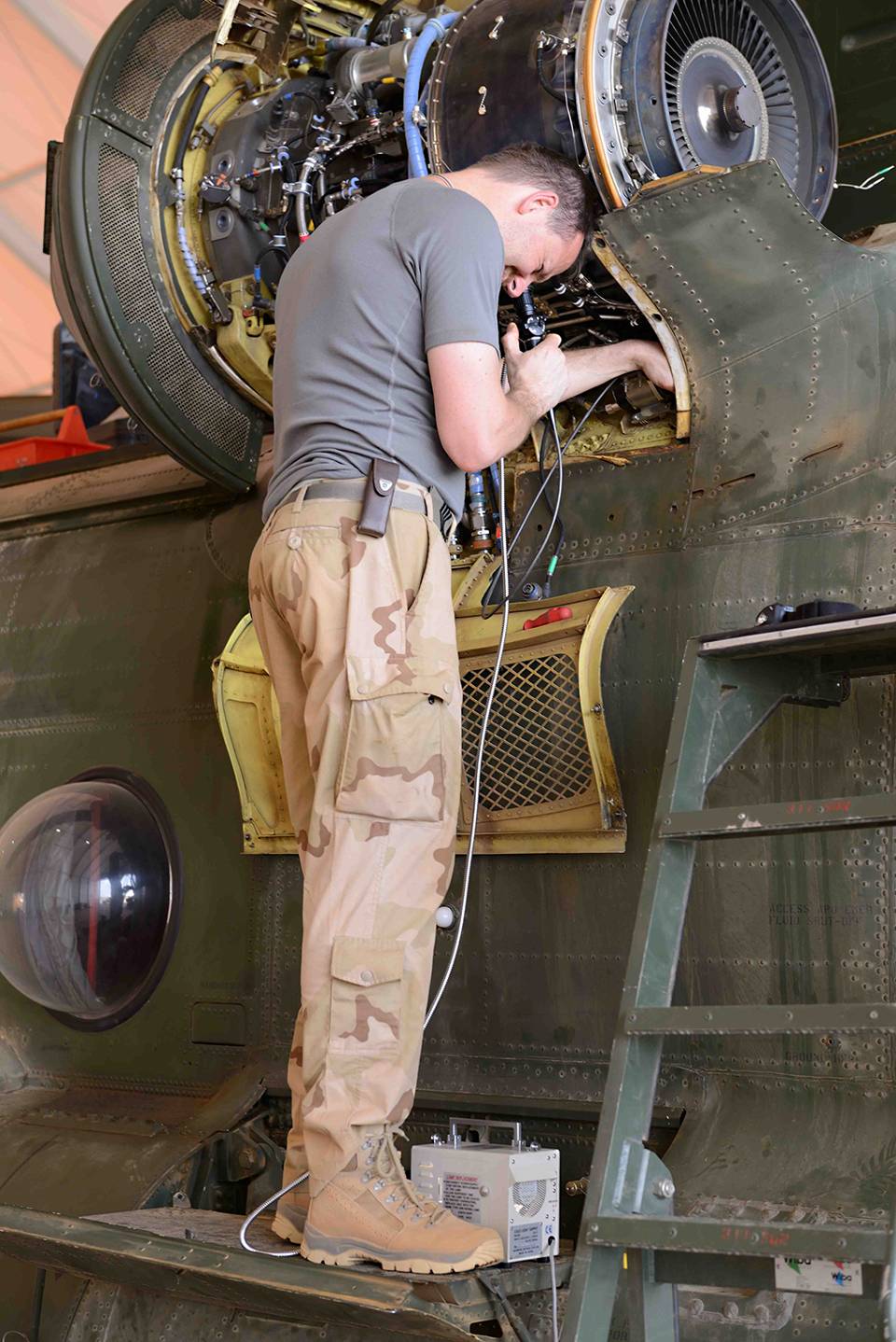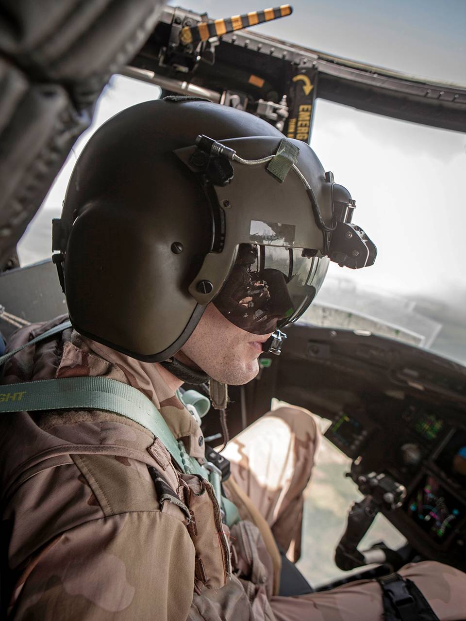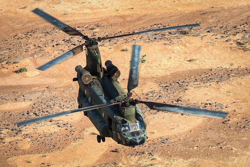Het trio Chinooks is operationeel inzetbaar sinds 15 september 2014, ten tijde van Helidet 3. Voor deze zwaargewichten is luchttransport de belangrijkste taak. Voor Medevac-doeleinden vliegen ze altijd samen met een Apache. In tegenstelling tot de gevechtshelikopters hebben de Chinooks geen airconditioning. Daarom draagt de bemanning vanaf Helidet 4 een speciale tweedelige flightsuit, gemaakt van Nomad; een dun, ventilerend en brandwerend materiaal. Niet zo gek, want vanaf april stijgt de temperatuur overdag naar 50˚C of hoger. Hitte is 1 ding, zand het tweede. Dat is vooral voor de helikopter zelf een uitdaging. Om de vele brown outs beter te kunnen doorstaan, zijn de tips van de rotorbladen bedekt met Erosion Protection Tape. Ter bescherming van de motoren is een Engine Air Particle Separator geplaatst voor de intake. Deze centrifuge verwijdert stof en zand voordat het de motor bereikt. De hoeveelheid zand die er na elke vlucht uitkomt, toon duidelijk de noodzaak van dit systeem.