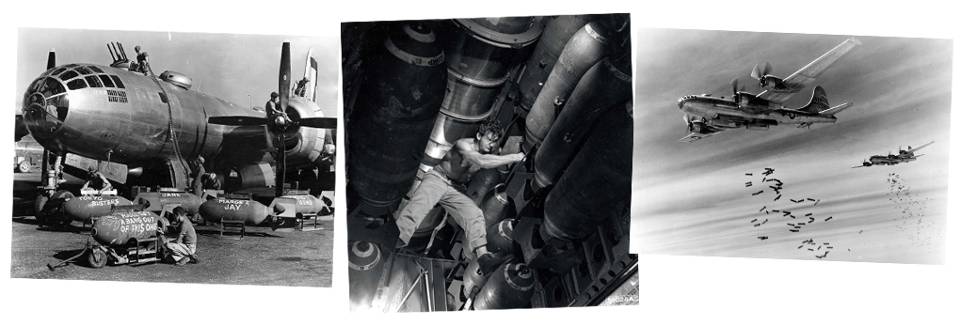 Japan wordt vanaf eind ’44 door zware lange afstandsbommenwerpers platgebombardeerd. Veel bouwwerken in Japan zijn van hout, en brandbommen blijken na een ‘proef’ op de stad Kobé, zeer succesvol. Het eerste doel daarna is Tokyo: maar liefst 334 B-29 leggen – aangewakkerd door de wind – zo’n 26 km² van de stad in de as. Op deze manier volgen talloze aanvallen, waarmee de oorlogsindustrie grotendeels wordt stilgelegd. Maar Japan geeft zicht niet over, waarna de VS besluiten tot 2 nucleaire aanvallen. Over het nut en de noodzaak van de atoombommen in relatie tot het beëindigen van de strijd is veel geschreven. Feit is dát ze plaatsvonden (zie kader).