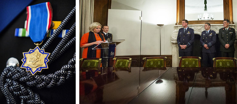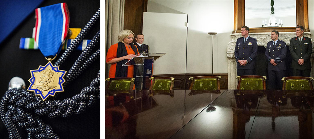 Voor hun inzet in de nasleep van de MH17-ramp in juli vorig jaar, ontvingen op 5 november 5 militairen het Ereteken voor Verdienste in goud. Onder de gedecoreerden waren 2 luchtmachters. Commodore Theo ten Haaf werd na de ramp de belangrijkste adviseur van de Nationaal Coördinator Terrorismebestrijding en Veiligheid. Daarnaast zette hij in Oekraïne een netwerk op voor de repatriëring van de stoffelijke overschotten en persoonlijke bezittingen van slachtoffers. Kolonel Johan van Soest was als commandant van Vliegbasis Eindhoven verantwoordelijk voor de luchtbrug tussen Nederland en Oekraïne en de ontvangst van de stoffelijke overschotten van vlucht MH17 op de vliegbasis. “Het georganiseerde eerbetoon aan de slachtoffers van MH17 heeft zowel nationaal als internationaal zeer positieve erkenning gekregen”, zei minister Hennis tijdens de uitreiking. “Dat maakte zeer veel indruk.” Naast de luchtmachters, kregen 2 militairen van de marechaussee en 1 van de landmacht het ereteken. Foto’s: Defensie