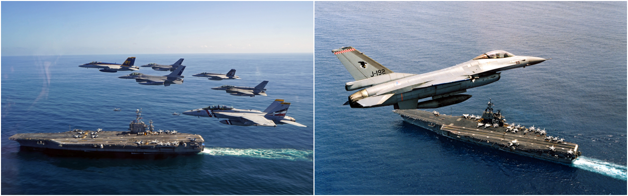 Soms kom je Nederlandse F-16’s op niet alledaagse plekken tegen. Of in dit geval, voormalig Nederlandse F-16’s, nu in dienst van Chili. De toestellen moesten de Koninklijke Luchtmacht verlaten door diverse bezuinigingen en vonden tussen 2006 en 2010 nieuw onderdak in Zuid-Amerika. Hier vliegen er op 19 oktober 2 samen met een Chileense Block 50M F-16D, en een US Navy F/A-18F (voorgrond) en 2 F/A-18E Super Hornets. De formatie vliegt tijdens oefening Unitas 2015 boven het vliegdekschip USS George Washington. Het brengt herinneringen terug van F-16’s van het (ondertussen opgeheven) 311 Squadron boven de USS Saratoga in 1992. Foto: J.G. David Babka en sergeant 1 Floris Griek