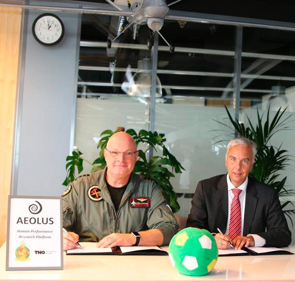 C-LSK luitenant-generaal Schnitger en professor Jos Keurentjes, Chief Scientific Officer van TNO zetten op 6 oktober met hun handtekeningen de start van AEOLUS in gang. Dat is een innovatieplatform van het Centrum voor Mens en Luchtvaart (CML) en TNO in Soesterberg dat zich richt op het functioneren van de mens in extreme omstandigheden in de lucht- en ruimtevaart. Het is voor het eerst dat de beide organisaties samen zo’n initiatief tot stand brengen.