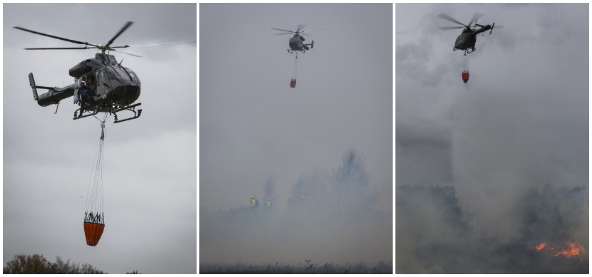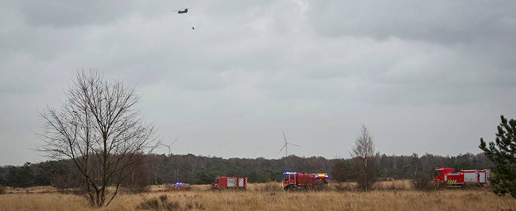 De Belgische hei staat in de fik en een flinke regenbui brengt daarin geen verandering. Om het vuur meester te maken, zijn enorme bakken water nodig. Daarom vliegen een Nederlandse Chinook en Cougar samen met een Belgische MD900 politiehelikopter af en aan. Om beurten droppen ze een paar duizend liter water op de brandhaard. En met succes.