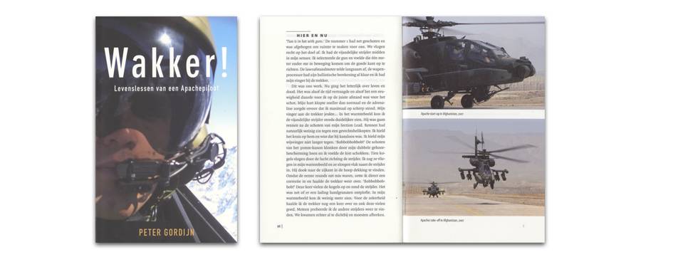 ‘Wakker! – Levenslessen van een Apachepiloot’ met ISBN 9789025904470 is geschreven door Peter Gordijn en uitgegeven door Kosmos Uitgevers in Utrecht. De paperback op formaat 13,5 x 21,5 cm telt 224 bladzijden en is voorzien van een katern met 32 kleurenfoto’s. Het boek kost € 16,99. Kijk voor meer informatie op www.petergordijn.nl, www.kosmosuitgevers.nl of bel met 088-7002600.
