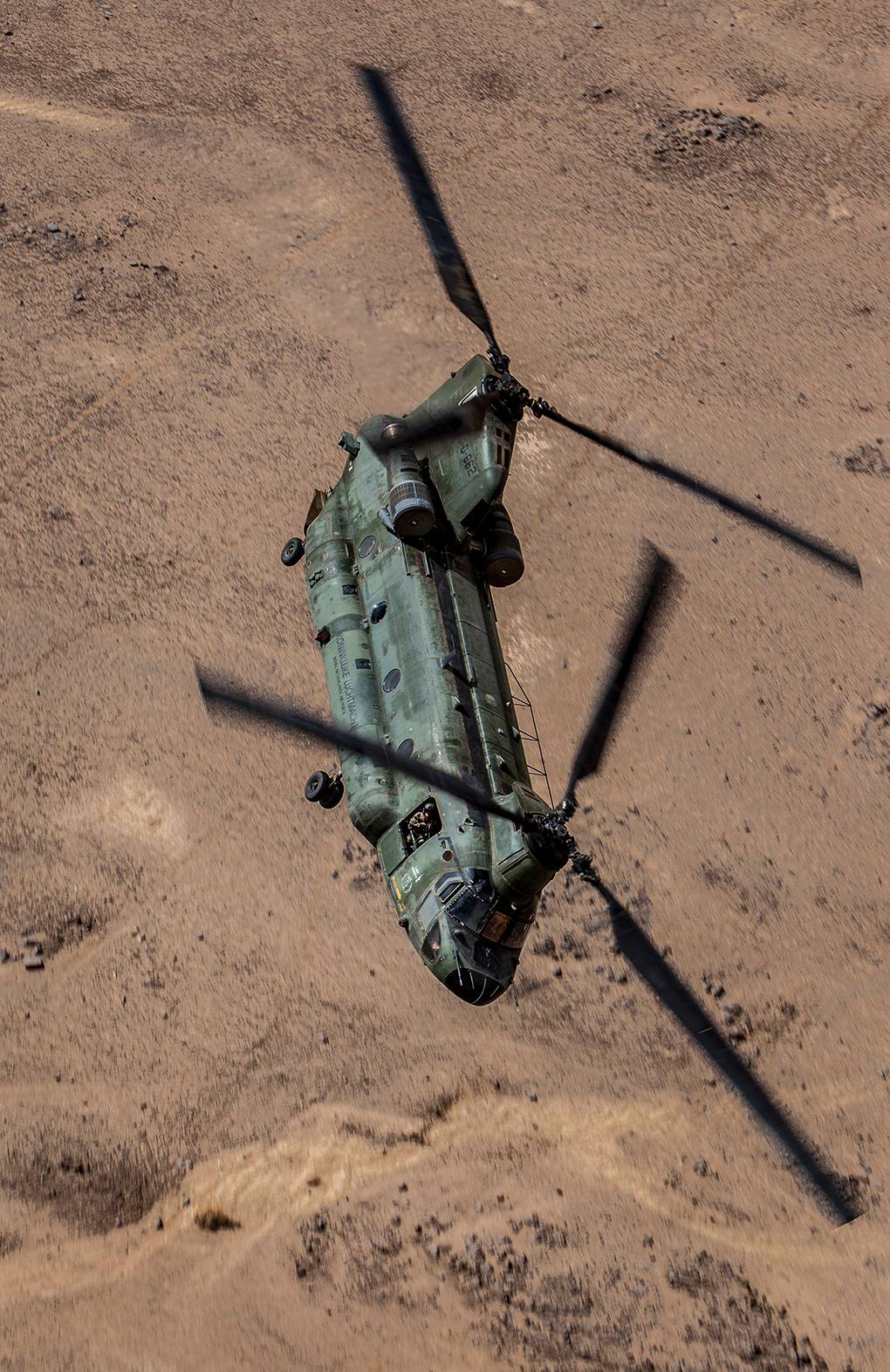 De Chinook vliegt nooit alleen. Door de veiligheidsdreiging in de regio gaan er altijd 2 heli’s op pad. Meestal met een Apache als beveiliging. Of met een 2de Chinook als wakend oog. “Als we aan de grond staan, is het altijd belangrijk dat we vanuit de lucht beschermd worden. Vooral in dit soort gebieden”, zegt Ralph. “Bij meldingen met veel gewonden rukken er soms 2 Chinooks uit. Daarnaast gaan er ook altijd militairen mee voor de rondom-beveiliging, zodat wij rustig onze handelingen kunnen uitvoeren.”