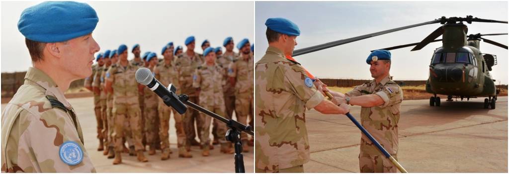 Luitenant-kolonel Huub Groothuis gaf in het 2e weekend van januari het commando over het helikopterdetachement in Mali over aan overste Eugene Quax. Met de commandowisseling op Kamp Castor in Gao begon ook de achtste rotatie. De luchtmacht ondersteunt VN-missie MINUSMA met 4 Apaches en 3 Chinooks. Foto’s: KLu