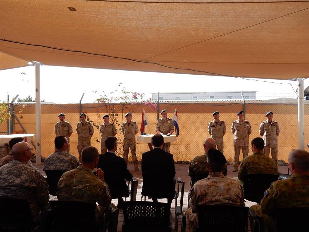 ‘Membres du détachement six, nous y sommes! Un détachement mixte composé de Belges et de Néerlandais, avec une tâche claire, fournir un soutien à la guerre contre ISIS.’ Hiermee opende de commandant van gemixte Belgisch- Nederlandse detachement 6, na de officiële overdracht, zijn toespraak. Foto’s: KLu