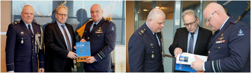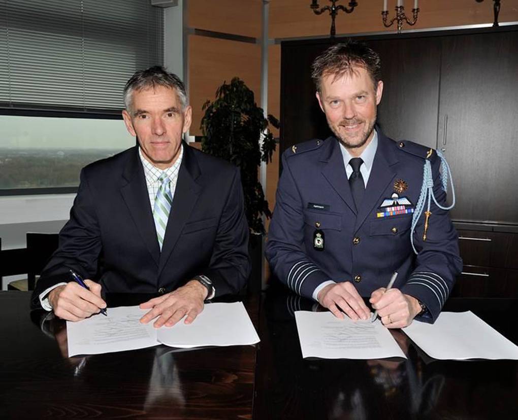 Chef Kabinet kolonel Marco Kathmann en voorzitter van de Koninklijke Nederlandse Vereniging Onze Luchtmacht (KNVOL) commodore b.d. Tom de Bok, tekenden begin januari een vierjarige overeenkomst in het belang van goede personeelszorg. Daarin staat dat CLSK-medewerkers bij het verlaten van de dienst een tweejarig lidmaatschap van de KNVOL aangeboden krijgen. De luchtmacht wil hiermee de verbondenheid tussen de luchtmacht en de medewerkers die recent de dienst hebben verlaten op positieve manier stimuleren. De overeenkomst die inging op 1 januari, is van toepassing op alle CLSK-medewerkers die een dienstverband van tenminste 4 jaar hebben voltooid en deze eervol hebben verlaten. Door middel van een antwoordkaart kunnen de dienstverlaters zelf aangeven of ze gebruik willen maken het aanbod. Foto: Willem Helfferich