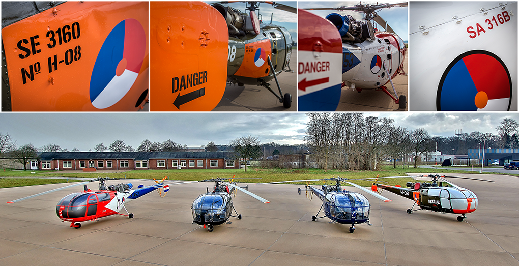 De levensloop van de Alouette III kwam onlangs op Gilze-Rijen nog 1 maal voorbij. Nou ja, stond op het platform; 4 Alouette III’s in de langst gebruikte operationele kleurstelling (zwart-groen), het koningsblauw van de laatste jaren, rood-wit-blauw van de Grasshoppers en groen met dayglow (oranje) van de Search and Rescue Flight. Dat laatste toestel droeg tot voor kort nog de kleuren zoals gebruikt in Cambodja; wit met rode olifantjes. In SAR-kleuren komt het toestel binnenkort op vliegveld Texel te staan. De groen-zwarte Alouette komt uit het leerdock van het 299 Squadron, de Grasshopper komt als ‘poortwachter’ bij het 298 Squadron te staan. De blauwe staat net als z’n 3 broers van 50 jaar oud te wachten op een koper. Grote foto: Natahan Alblas. Kleine foto’s: sergeant-majoor Arnoud Schoor