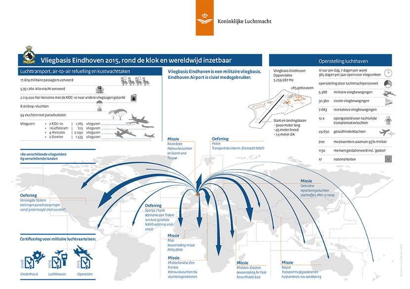 In navolging van 2014 zijn ook over vorig jaar de vluchten vanaf vliegbasis Eindhoven grafisch in beeld gebracht met een infographic. De getallen en pijlen laten zien dat ook 2015 in het teken stond van het bevoorraden van Defensiepersoneel in missiegebieden, het in de lucht bijtanken van vliegtuigen en uitvoeren van kustwachttaken. Naast vliegen en het onderhouden van vliegtuigen, zorgt Defensie dat de civiele luchthaven 17 uur per dag, 7 dagen per week, 365 dagen per jaar is geopend voor vliegverkeer. Niet alleen voor Defensie, maar vooral voor reizigers van Eindhoven Airport.