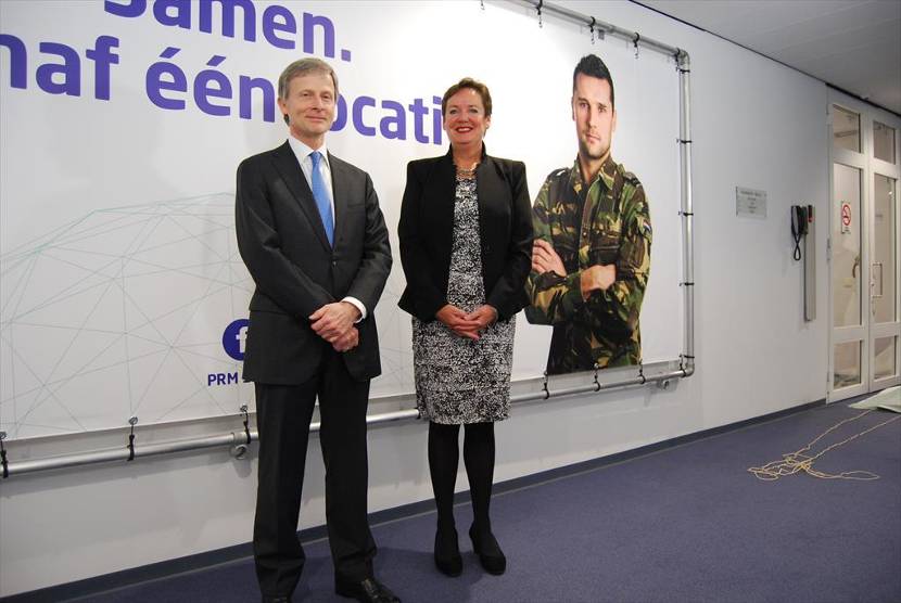De hoogste ambtenaren van Defensie en Infrastructuur en Milieu, Marc Gazenbeek en Lidewijde Ongering onthulden het nieuwe doek met daarop luchtverkeersleiders van beide organisaties.