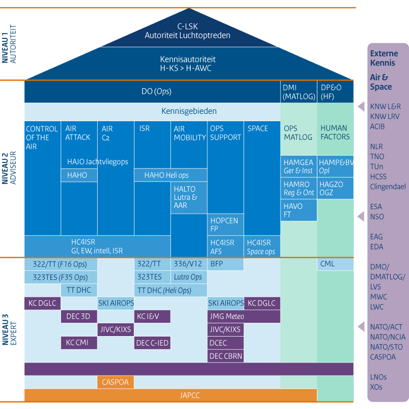 Daarvoor zorgt het AWC, hét kenniscentrum van de luchtmacht. “Wij leren ván en uit het verleden, evalueren, onderzoeken en studeren op de toekomst.”, zegt luitenant-kolonel Johan, Hoofd AWC. “Dat laatste sturen we met het LuKIP. In theorie weten wij ‘alles’, maar we zijn bij het AWC met slechts 5 man. In de praktijk hebben we dus verre van alle kennis zelf in huis, maar weten wél waar we dat in onze organisatie of daarbuiten kunnen vinden. We weten bij wie we moeten zijn.” Daarvoor gebruikt het ASWC de zogenoemde kennispiramide, zie onderstaande afbeelding. Samenwerken met collega-luchtmachten, andere landen en organisaties. Johan: “Wij coördineren en weten waar kennis en info beschikbaar gaat komen. En waarover nog niet voldoende kennis is, onderzoeken we. Maar wetenschappers hebben we zelf niet. Dat is uitbesteed bij het Nationaal Lucht- en Ruimtevaartlaboratorium en TNO. 1 van ons werkt 1 dag in de week bij hen en omgekeerd. Het werk dat de personen doen is hetzelfde als op de eigen locatie, maar het gaat vooral om het terloopse contact, het van horen zeggen: ‘hé, kijk eens waarmee wij bezig zijn? Wat doen jullie daar eigenlijk mee?’ En zo gaan veel balletjes rollen.”