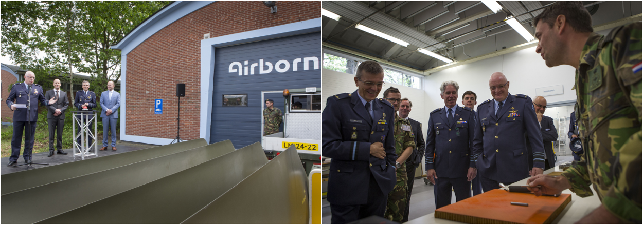 Volgens Schnitger was de opening typerend voor de huidige manier van werken bij de luchtmacht: samenwerken door open communicatie, vernieuwend ondernemerschap en de focus op innovatie. Commandant LCW commodore Mario Verbeek wees erop dat de samenwerking tussen het LCW en de bedrijven in de omgeving gunstig is voor verlaging van de onderhoudskosten en vergroting van de flexibiliteit. Directeur Airborne Arno van Mourik zei dat het LCW alle voordelen combineert van een vestiging op een beveiligde luchtmachtbasis, het medegebruik van de bestaande infrastructuur en de samenwerking met het er naastgelegen Business Parc Aviolanda. Foto: sergeant-majoor Eva Klijn