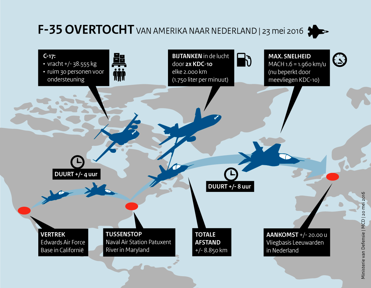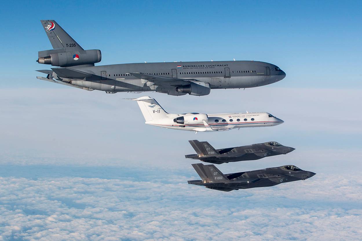 Om 10 voor 7 in de ochtend stapt op Patuxent River Naval Air Station de ground crew van de Nederlandse F-35’s de cabine van 1 van de 2 KDC-10’en binnen. Van de overige passagiers en bemanning krijgen ze applaus. Zojuist hebben de technici de laatste hindernis weggenomen om het duo jachtvliegtuigen naar Nederland te laten vliegen. Als de F-35’s naar de startbaan taxiën, komen ook de motoren van de KDC-10’en tot leven. “Arm slides and cross check”, klinkt het door de passagiersruimte. Nederland, ze komen eraan.