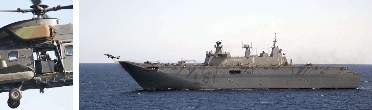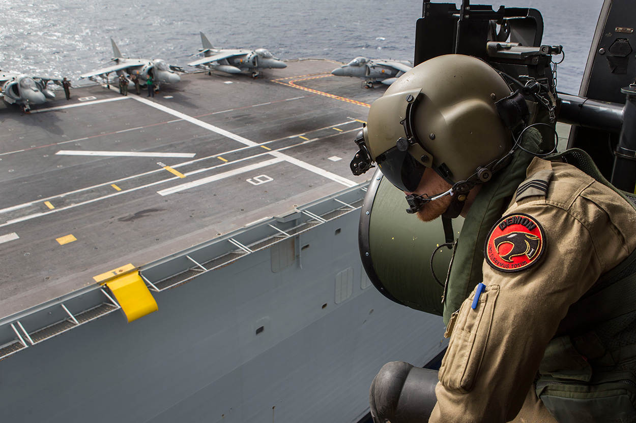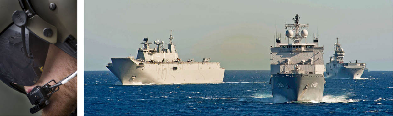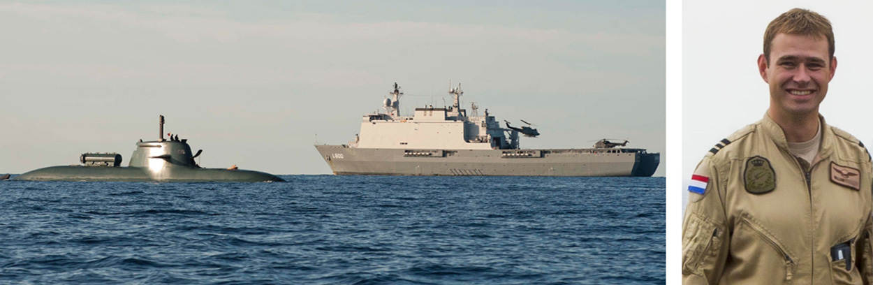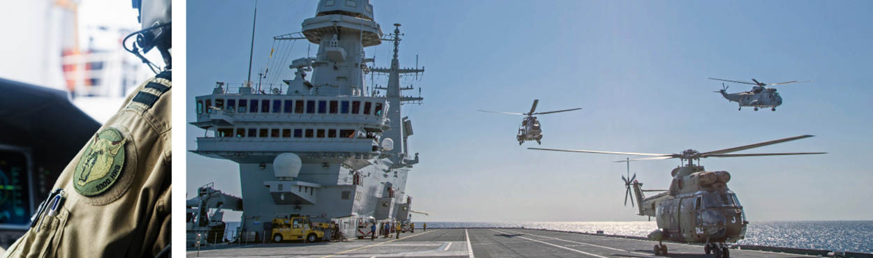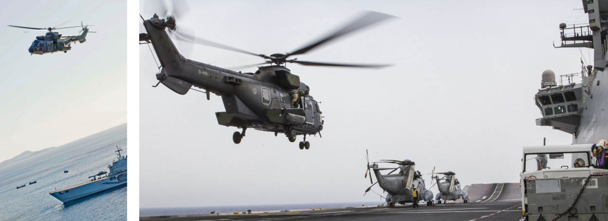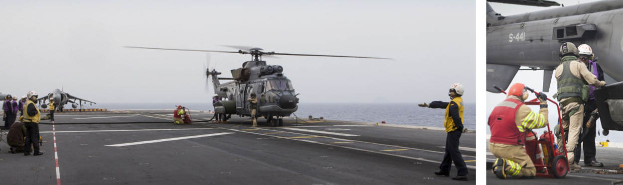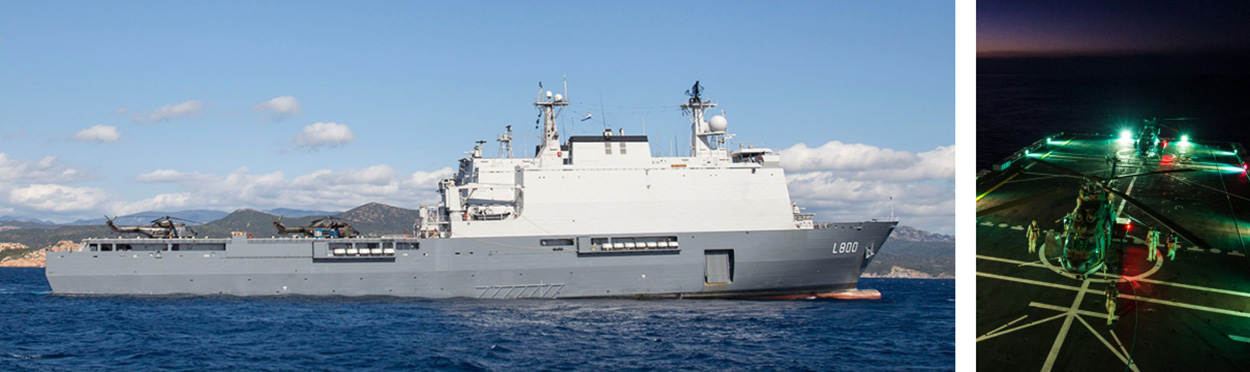 In het vlootverband varen ook 3 helikoptercarriers: de Italiaanse ITS Cavour, de Franse Mistral en de Spaanse Juan Carlos. Daar ‘oplanden’ was een bijzondere ervaring, vond de vlieger. “Machtig mooi. Tientallen mensen in gekleurde hesjes op het helidek. Ieder heeft zijn eigen taak, in één gestructureerd geheel.”