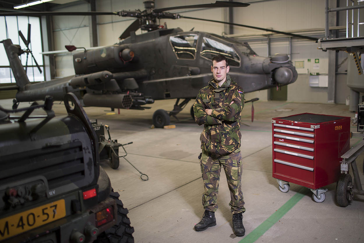 Jan is verantwoordelijk voor het onderhoud aan alle kisten van het Defensie Helikopter Commando. Met uitzondering van de NH90, want dat is een zaak van de marine. Het betreft preventief onderhoud zoals de 25-uurs inspectie, en dagelijkse controles. Maar ook correctief onderhoud, ofwel grote en kleine problemen oplossen. “Problemen die zomaar uit de lucht komen vallen”, vertelt Jan. “Bij elk heli-type ligt dit weer anders. Bij de Apache, een soort vliegende computer, is de kans op technische problemen groter dan bij de Chinook die veel degelijker in elkaar zit. Als het nodig is, werken we klok rond om de problemen te verhelpen. De operaties van het DHC móeten doorgaan.”