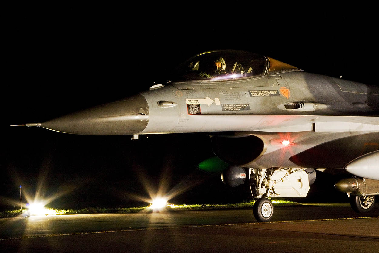 In uitzendgebieden vindt inzet van F-16’s rond de klok plaats. Het toestel is goed uitgerust voor nachtelijke operaties. Voor nachtelijke operaties gebruiken de vliegers nachtkijkers, ofwel helderheidsversterkers. Foto boven: Mike Schoenmaker