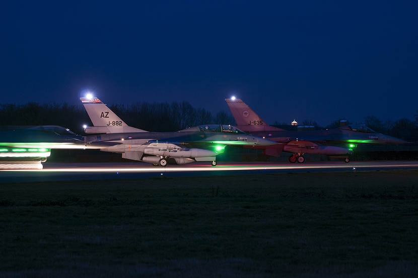 Om vliegers optimaal voor te bereiden op hun taak, wordt op vliegbases Leeuwarden en Volkel van eind oktober tot en met midden december getraind. Vluchten gaan door tot uiterlijk 23.00 uur. Op vrijdag zijn alleen overdag vliegoperaties. Foto boven: Bart van der Does