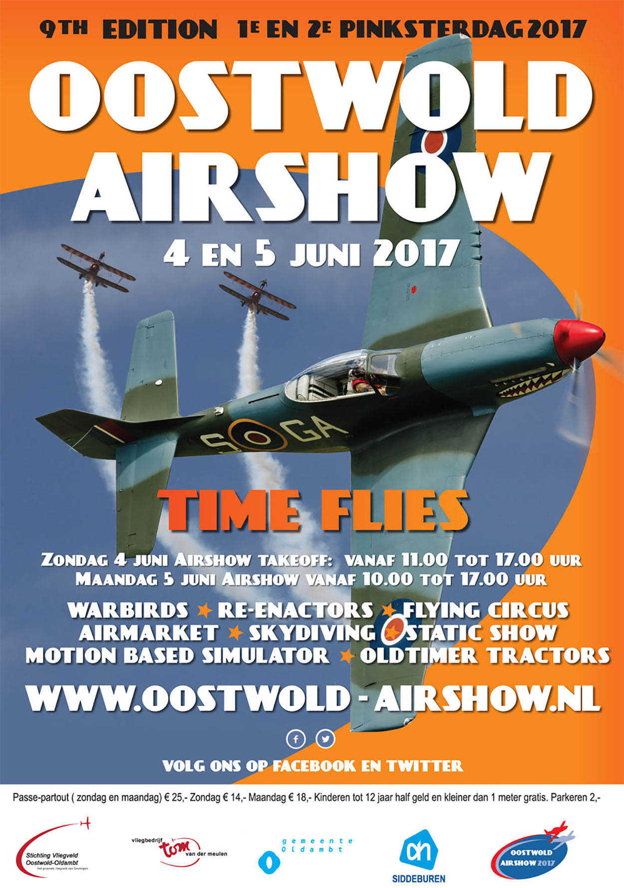 Op eerste en tweede Pinksterdag, ofwel 4 en 5 juni, vindt de 9e editie plaats van de Oostwold Airshow. Met ruim 20.000 betalende bezoekers is dit het grootste evenement in de Nederlandse burgerluchtvaart. Onder het motto ‘Time Flies’ kunnen bezoekers genieten van diverse vliegstunts, formaties WarBirds en opvallende hedendaagse vliegtuigen. Behalve veel historische vliegtuigen zijn er verschillende antieke trekkers, voertuigen en een compleet militair kamp uit de Tweede Wereldoorlog te bewonderen. Het burgerluchtvaartevenement vindt ieder oneven jaar met Pinksteren plaats op vliegveld Oostwold.
