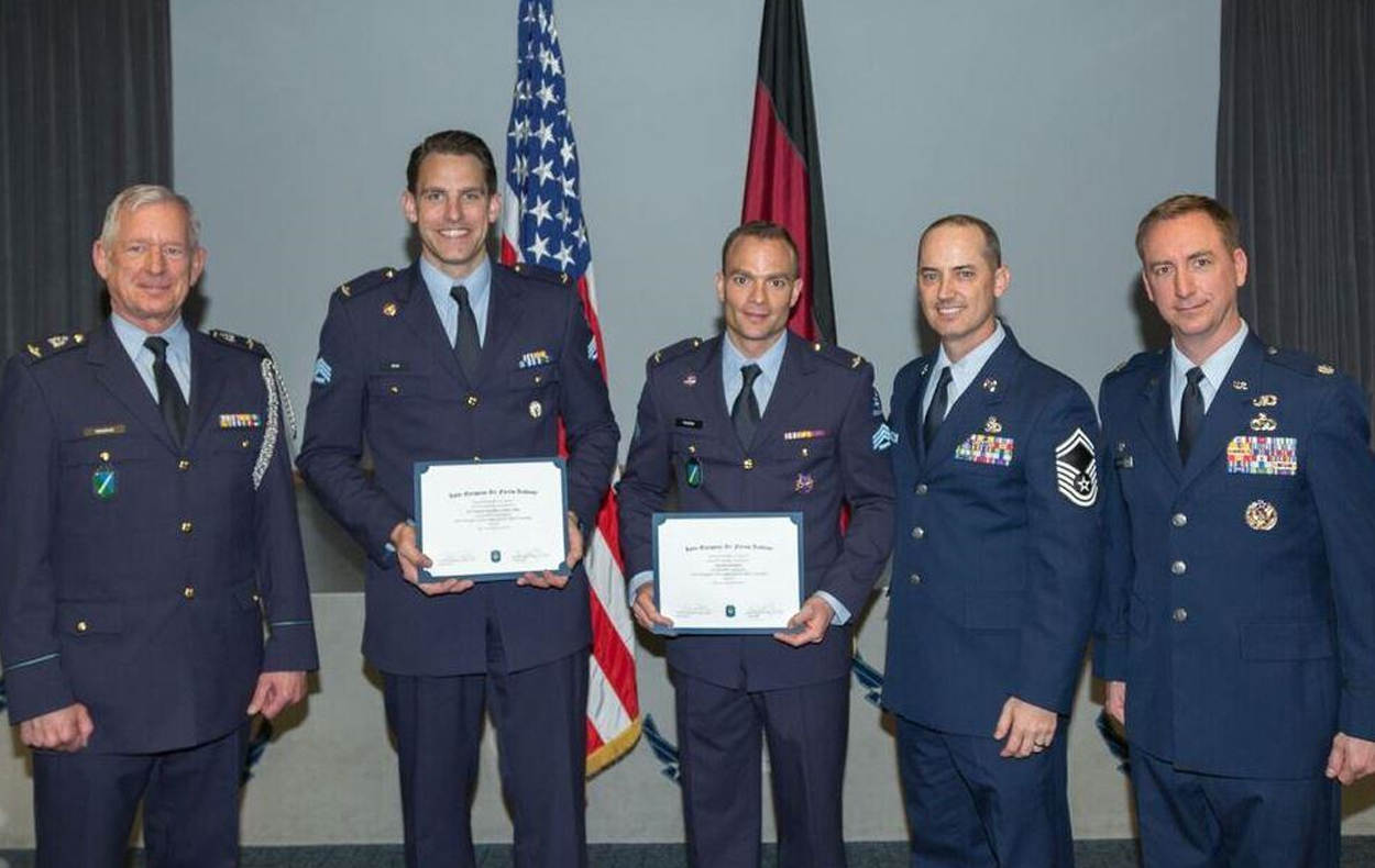 Samen met 30 deelnemers uit 13 verschillende landen namen sergeanten 1 Boaz Hardijzer (802 Squadron) en Johan Blom (130 Squadron) in maart en begin april deel aan de Inter European Air Force Academy. De focus van deze opleiding, verzorgd door US Air Force op Ramstein Airbase, ligt op leiderschap en het leren van verschillende culturen. Het zorgt voor verbreding voor de verdere ontwikkeling van luchtmachtonderofficieren. Foto: USAFE