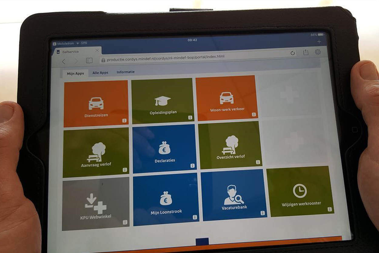 Met ingang van deze maand zijn de meeste intranetpagina’s ook beschikbaar via Web@Work op iPhones en iPads van Defensie. Voorbeelden zijn PeopleSoft en Selfservice. Dit was voorheen niet mogelijk. Toegang tot niet beschikbare pagina’s zijn aan te vragen via de IV-manager.