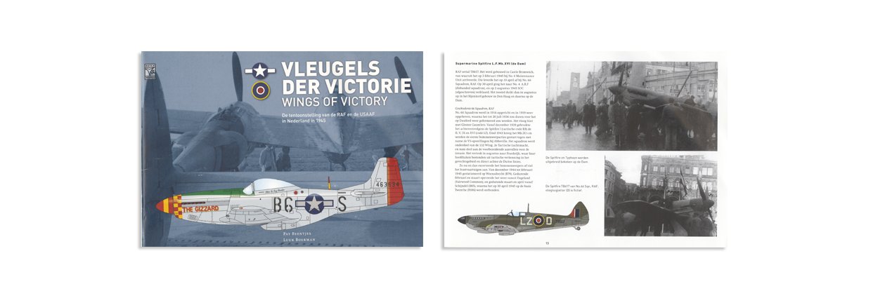 ‘Vleugels der victorie – Tentoonstelling van de RAF en USAAF in Nederland in 1945’ met ISBN 9789490092115 is samengesteld door Pat Beentjes en Luuk Boerman (tevens uitgever). De softback op formaat 29,5 x 20,6 cm telt 27 pagina’s, voorzien van 2 kleuren- en 55 zwart-witfoto’s en 3 kleurenprofielen. Het boekje kost €17,50 en is onder ander te bestellen via www.dutchprofile.nl.
