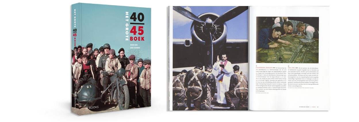 ‘Het Grote 40-45 Boek’ met ISBN 9789462581715 is geschreven door Erik Somers en René Kok in samenwerking met het NIOD en uitgegeven door WBooks in Zwolle. De softback op formaat 19,5 x 25 cm telt 368 pagina’s en is voorzien van vele tientallen kleuren- en honderden zwart-witfoto’s. Het boek kost € 19,95. Kijk voor meer informatie op www.wbooks.com.