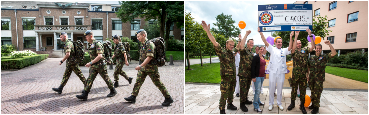 De aanbieders lieten zich sponsoren tijdens de laatste editie van de Nijmeegse vierdaagse. Het geld is bestemd voor de neonatologische intensive care unit. Aanleiding voor de schenking was het overlijden van de te vroeg geboren tweeling van luchtmachtmilitairen Axel en zijn vrouw Christianne in het WKZ. Dat gebeurde vorig jaar op 24 november.