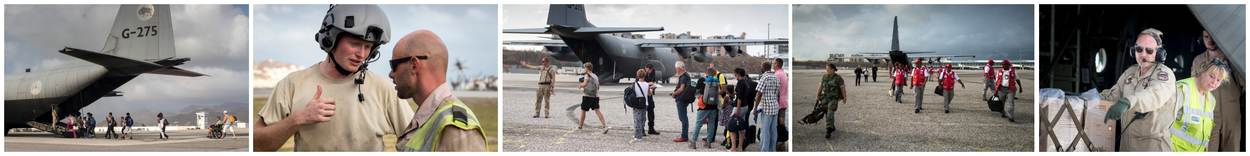 Twee keer per dag landt een Nederlandse Hercules op het internationale vliegveld van Sint-Maarten. De landingsbaan is inmiddels brandschoon, maar daarmee is ook alles gezegd. Vertrekhallen zijn zwaar beschadigd en worden nog niet gebruikt. Buiten wachten mensen uren in de snikhete zon op hun verlossende vlucht het eiland af. Sommige vakantiegangers en bewoners zijn zelf naar het vliegveld gelopen, anderen met bussen of door mariniers vervoerd. Marechaussee, mariniers en luchtmobiel leiden alles aan de rand van het vliegveld in goede banen, doen veiligheidscontroles en maken volgens de richtlijnen die ze hebben afwegingen wie wel en (nog) niet mee mag. Gewonden, ouderen, vrouwen, kinderen en baby’s eerst. Luchtmachters werken hard om alle hulpgoederen uit de vliegtuigen naar de opslag te brengen. Hier nemen militairen van de Luchtmobiele Brigade het over; zij helpen bij de distributie van de spullen.