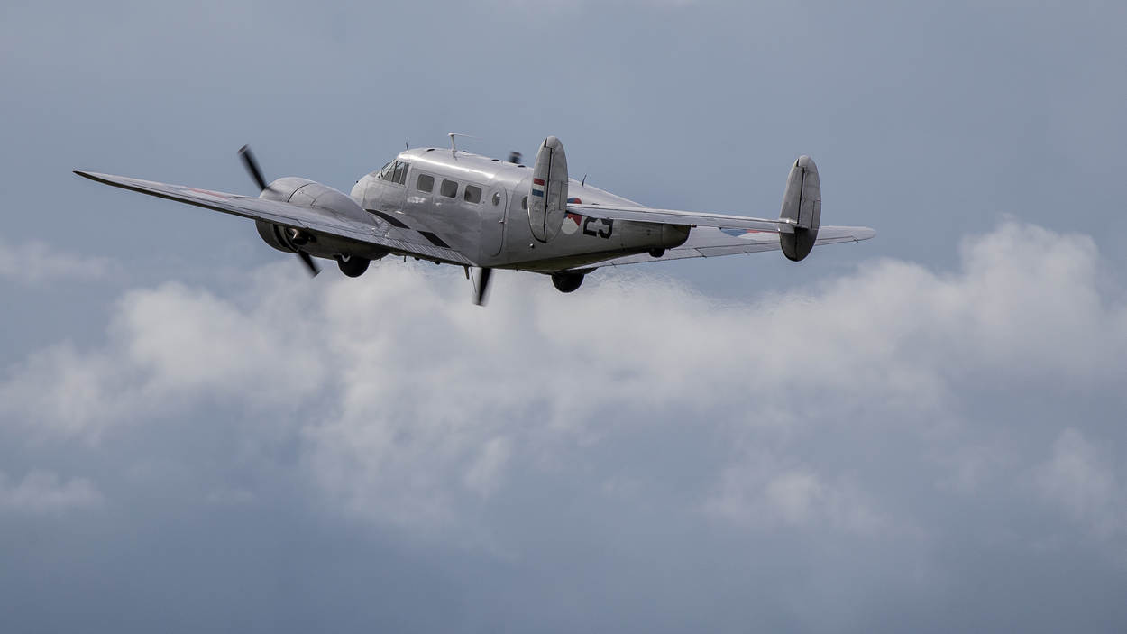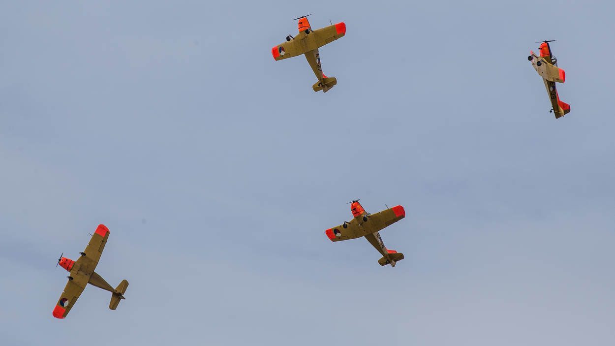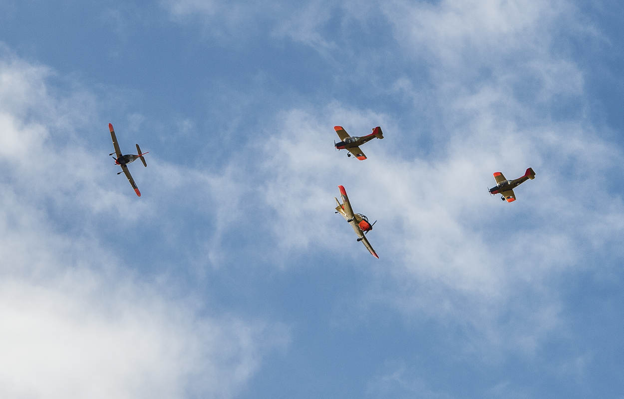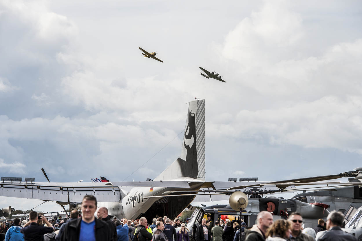 Samen vliegen beide toestellen van de KLu Historische Vlucht een demonstratie. Op de voorgrond een Duitse C-160 en Britse Wildcat.