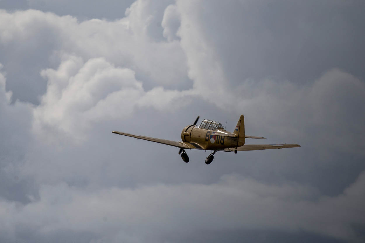 MLD-personeel flankeert tijdens de herdenkingsdienst een toestel uit het verleden, een SP-2H Neptune. Kransen werden onder anderen gelegd door de C-ZSK, veteranen en nabestaanden, en door C-LSK luitenant-generaal Dennis Luyt en zijn majoor-adjudant Linda Lauret.