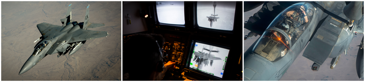Eenmaal in de lucht zit de ‘boomer’ met 2 joysticks in zijn handen achter een rij videoschermen. Hij tuurt naar de kisten die de KDC-10 naderen. De ene keer een enkele grote, dan weer 3 fighters aan de linkervleugel, 3 aan de andere kant. Soms met slechts een paar meter afstand van elkaar. Bij een snelheid zo’n 550 kilometer per uur zorgt de crew ervoor dat tanker en receivers elkaar veilig naderen. Pas dan kan de brandstof overgeheveld worden. “En daarvoor moet je veel oefenen”, zegt de boomoperator. “Heel veel.”
