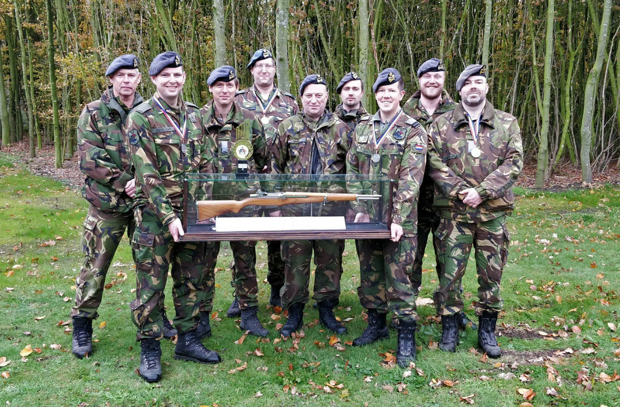 Tijdens het kampioenschap op Vliegbasis Volkel op 15 november, werd er door het Woensdrechtse schietteam wederom stevig gescoord. Maar liefst 4 van hun 5 geweerschutters (Colt) haalden de finale. Eerste luitenant Jaap van der Laan behaalde daarbij de 1ste plaats en kapitein Sander von Piekartz (beiden LCW) werd 2de. Bij het klassement pistoolschieten (Glock) stonden alle 3 de Woensdrechtse pistoolschutters in de finale, met een 1ste plaats voor sergeant 1 Martijn de Vries (LCW) en de 2de voor adjudant Johan Havelaar (KMSL). Door deze resultaten was dus ook de onderdeelsbeker schieten voor Woensdrecht. Foto: Schietteam Main Support Base Vliegbasis Woensdrecht