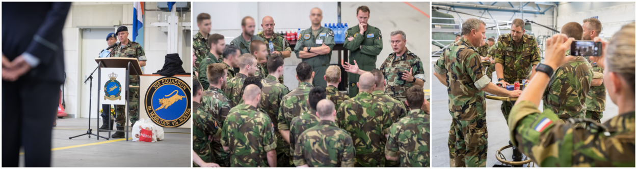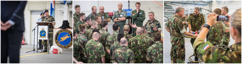 Dat heeft sinds lange tijd weer meer vliegende helikopters, waardoor het aantal vlieguren nu pas weer op het niveau van april 2015 komt. “Dat moet gevierd worden”, dacht Bauer en liet taart halen voor de eenheid. Met 2 grote plastic zakken liep hij de hangaar in, waar op dat moment adjudant Peter Fritsema een gouden medaille kreeg. Na een felicitatie voor hem, richtte de CDS het woord tot het 300 Squadron. “Jullie hebben dankzij de extra vlieguren meer kunnen oefenen, trainen en brengen daarmee de inzetgereedheid op een hoger peil. Oftewel, meer heli’s in de lucht en meer vliegers die meer uren kunnen maken. Natuurlijk zijn we er nog lang niet, maar er lijkt echt een kantelpunt te zijn bereikt. Het extra geld voor het herstel en de focus op de inzetgereedheid werpt nu vruchten af.” Maar hij benadrukte dat het vooral de persoonlijke inzet is van elke medewerkers die verantwoordelijk is voor een deel van de keten. “Of het nu de techneut, de logistiekeling of de vlieger is. Of de samenwerking met anderen buiten het squadron, zoals DMO. Samen hebben jullie dit resultaat bereikt en daar mogen jullie ongelooflijk trots op zijn.” Foto’s: sergeant Sjoerd Hilckmann