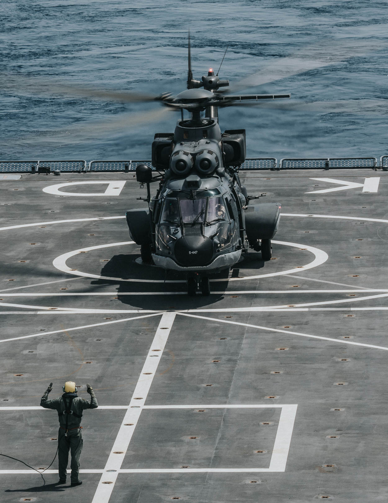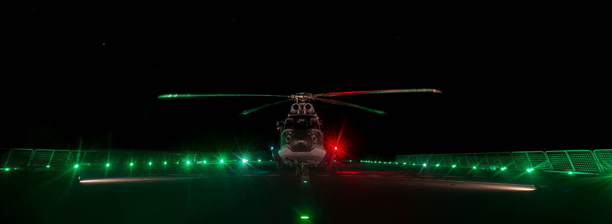 De Karel Doorman is voor de Cougar-bemanning een nieuwe werkplek. Zr. Ms. Johan de Wit en Rotterdam kennen de luchtmachters goed. “Daarop zijn we al vaak meegevaren. De Doorman is veel groter”, geeft Sacha aan. “Best even wennen en het heeft zo zijn voor- en nadelen. Indien noodzakelijk is met zo’n groot vliegdek de kans op een succesvolle noodlanding natuurlijk groter. Daarnaast past de heli in zijn geheel in de hangaar. De onderhoudsploeg hoeft niet eerst de rotorbladen te demonteren; dat scheelt minstens een uur.” Maar tijdens het nachtvliegen komt de crew er achter dat aan zo’n enorm schip ook nadelen kleven. “Onze referentiepunten, zoals de opbouw van het schip, zijn tijdens het landen verder weg dan gewend”, legt Sacha uit. “Met onze night vision goggles schakelen we tussen wat direct naast ons zit en wat verder weg is te zien. Maar dat laatste is slechter zichtbaar. Alles is goed gegaan, maar ’s nachts landen is een tandje moeilijker dan op een minder groot schip.”