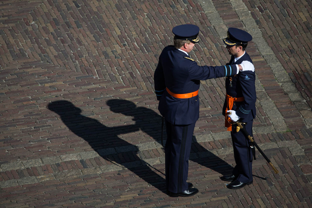 “Zo waarlijk helpe mij God almachtig.” De Ruiters eed galmt door de luidsprekers. Met een slag op de schouder van de koning mag De Ruiter zich ridder noemen en zich bij zijn voorgangers voegen. Het is een weerzien met zijn maat luitenant-kolonel Gijs Tuinman waarmee hij meerdere operaties in Afghanistan uitvoerde. De omhelzing is er duidelijk een van strijdmakkers met een gedeeld krijgsverleden. “Roy is een Gijs in de lucht. Een groter bewijs van respect is nauwelijks denkbaar”, memoreert de koning de uitspraak van een militair op de grond. Net als Tuinman is De Ruiter een tactisch creatieve militair. “Beleid wordt niet alleen op de basis gemaakt, maar ook in de cockpit terwijl de granaten langs suizen en de adrenaline – in de woorden van een vlieger – tegen de oogkassen klotst”, vervolgt de koning. “Om dan de rust en het overzicht te bewaren, moet je uitzonderlijke capaciteiten hebben. Majoor De Ruiter heeft bewezen daarover te beschikken.”