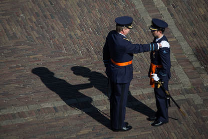 Op het commando van paradecommandant en voormalig commandant van het 301 Squadron, kolonel Pier Schipmölder, treedt De Ruiter uit de gelederen. Het is doodstil in het ‘hart van de democratie’ zoals minister van Defensie Ank Bijleveld het Binnenhof in haar toespraak noemt. Alleen de voetstappen van de exercerende De Ruiter zijn hoorbaar. Hij salueert de koning en luistert ogenschijnlijk onbewogen.