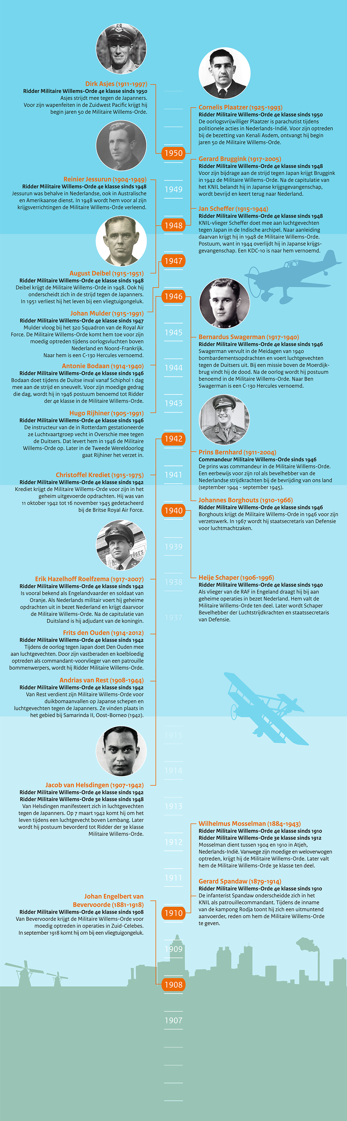 Personeel en ‘zeer verdienstelijke oorlogsvliegers’ van de Koninklijke Luchtmacht en haar voorgangers hebben het luchtwapen de afgelopen eeuw internationaal aanzien gegeven. Voor de inzet in de Meidagen van 1940 kreeg het Wapen der Militaire Luchtvaart van de Koninklijke Landmacht – als geheel – al op 18 mei de Militaire Willems-Orde der 4e klasse. Na de strijd tegen Japan wordt op 12 maart 1942 ook aan het Wapen der Militaire Luchtvaart van het Koninklijk Nederlands-Indisch Leger (KNIL) de hoogste Nederlandse dapperheidsonderscheiding toegekend. Aan individuele militairen is dat eerbewijs eveneens uitgereikt. De luchtmacht had ooit 21 – intussen overleden – ‘ridders’ in de slagorde; een overzicht.