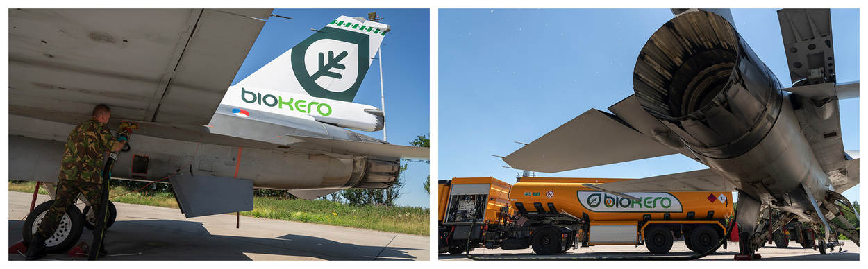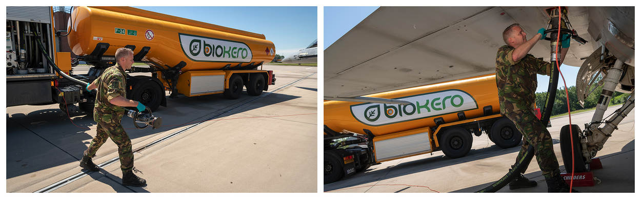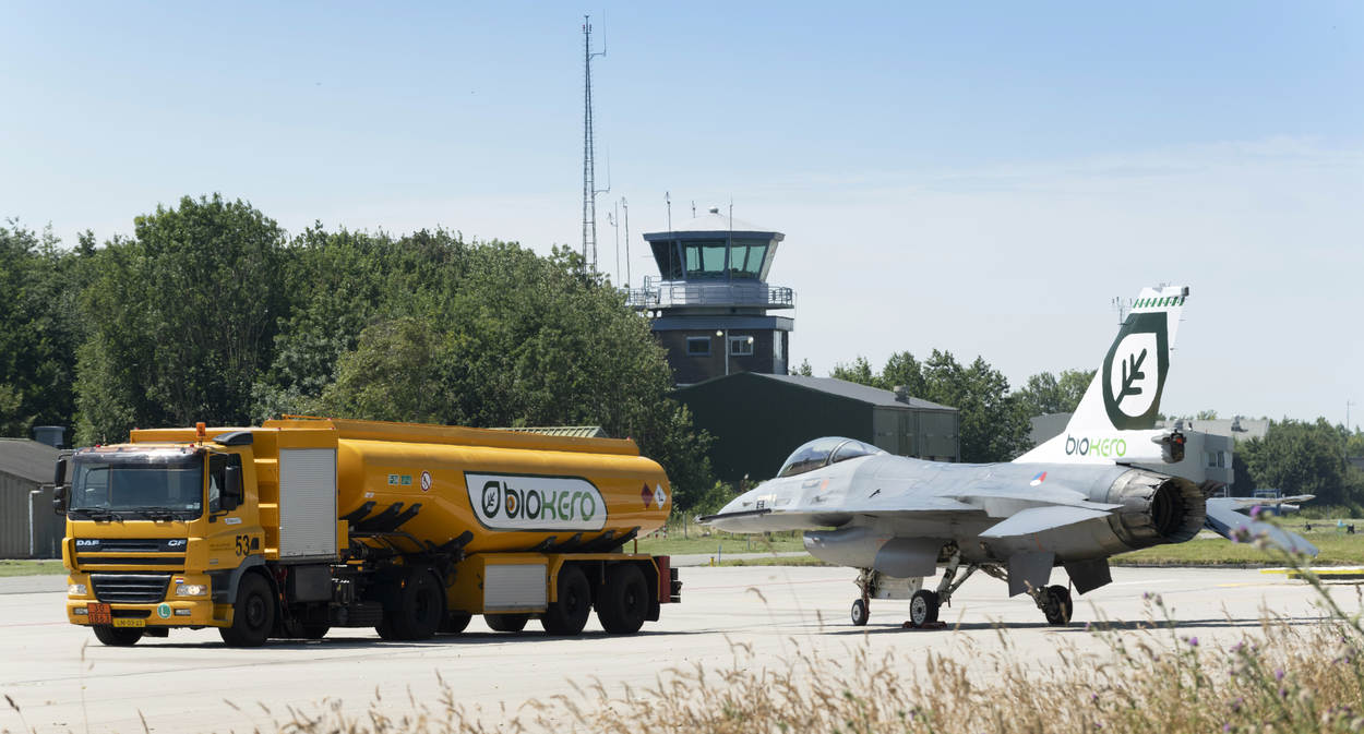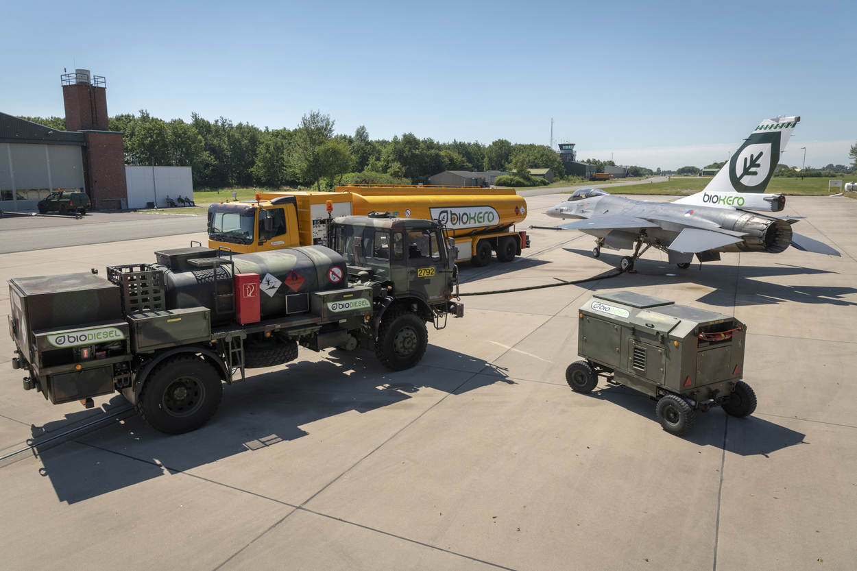1.200 liter biobrandstof van de firma SkyNRG is genoeg om 1 F-16 2 weken te laten vliegen met 5% plantaardig vet in de tank. “Bijmengen kán en mag tot 50%, maar dat is nu nog simpelweg te duur”, weet kolonel Paul de Witte, hoofd afdeling Materieellogistieke Regelgeving en Ontwikkeling. Het product komt overeen met gewone kerosine, maar mist cyclische verbindingen die zorgen voor fijnstof in de lucht. Biofuel zorgt voor 70 tot 80% minder CO2 uitstoot en voor een reductie in fijnstofuitstoot. Groot probleem: het bewerkte vet is nog peperduur én moet uit Amerika komen. De vliegbasis heeft duurzaamheidscoördinator Henk de Koning aangesteld om voortgang te krijgen in het project met biofuel en andere duurzame initiatieven: “Aan de operationele kant doen we geen concessies; de vliegers merken niets van de biokerosine in hun tank. Elektrisch vliegen met gevechtsvliegtuigen kan nog niet, maar ik vind het helemaal super dat we een begin hebben gemaakt met duurzaam vliegen.”