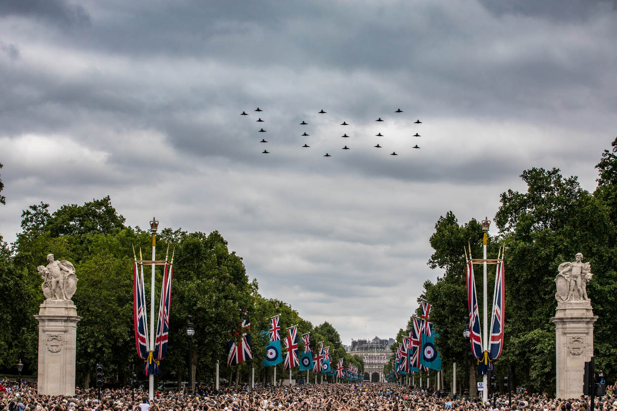 Jaarlijks toont de RAF zich bij de parade op en boven The Mall midden in Londen aan het Britse publiek. Vanwege de 100e verjaardag, uitgebeeld door 22 Eurofighter Typhoons, was de flypast afgelopen 10 juli de meest uitgebreide van de afgelopen jaren. Foto: RAF/Crown Copyright