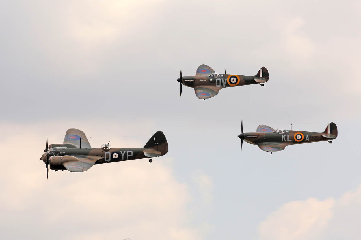 Tijdens de Battle of Britain-demonstratie vliegt een uiterst zeldzame Bristol Blenheim in formatie met de eerste versie van de Spitfire. Foto: Arno Marchand