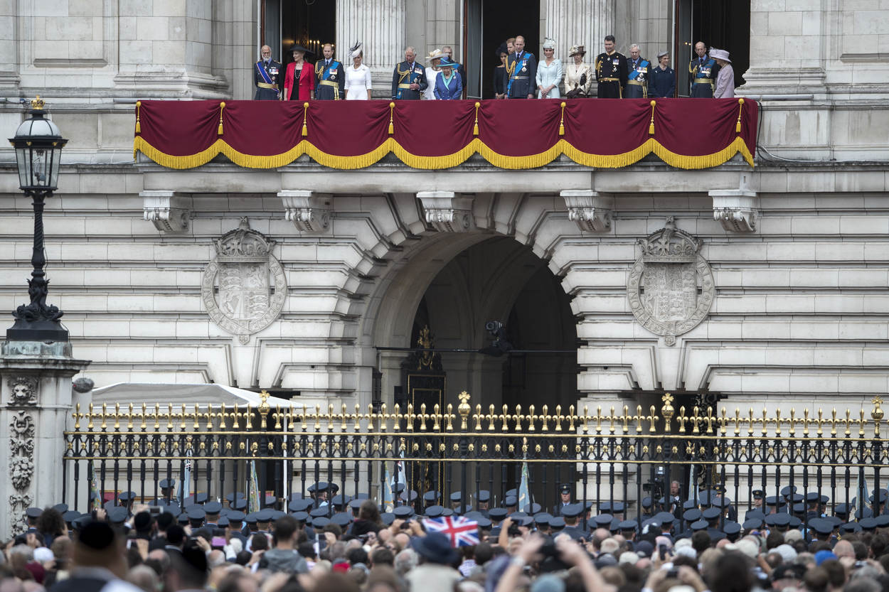 The Mall ligt aan de oostzijde van Buckingham Palace. Daar neemt koningin Elizabeth (midden) en een groot deel van de koninklijke familie traditiegetrouw het defilé af.