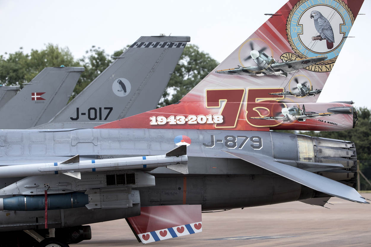 De F-16 met jubileumstaart van het 322 Squadron op de static show. Daar stond onder andere ook een CH-47 van het 298 Squadron en een Dornier van de Kustwacht die administratief onder het 334 Squadron valt. Daarmee waren alle – nog bestaande – Nederlandse voormalige RAF-squadrons op Fairford vertegenwoordigd.