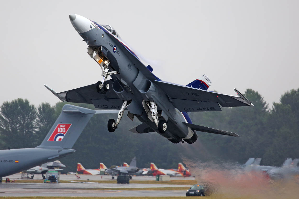 Ook de Canadese luchtmacht is zeer nauw gelieerd aan de RAF. Vanwege de 100e verjaardag stuurde Canada daarom het F/A-18 solo display team naar Fairford. Foto: Arno Marchand