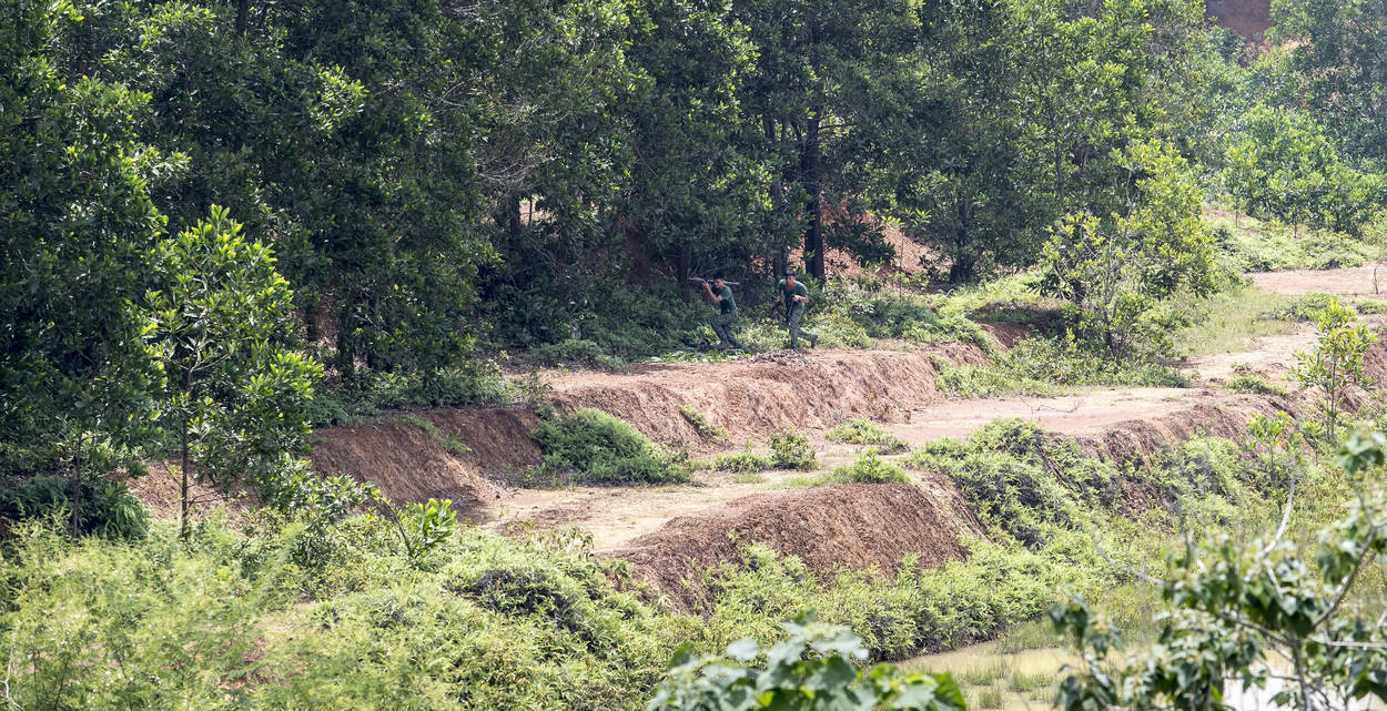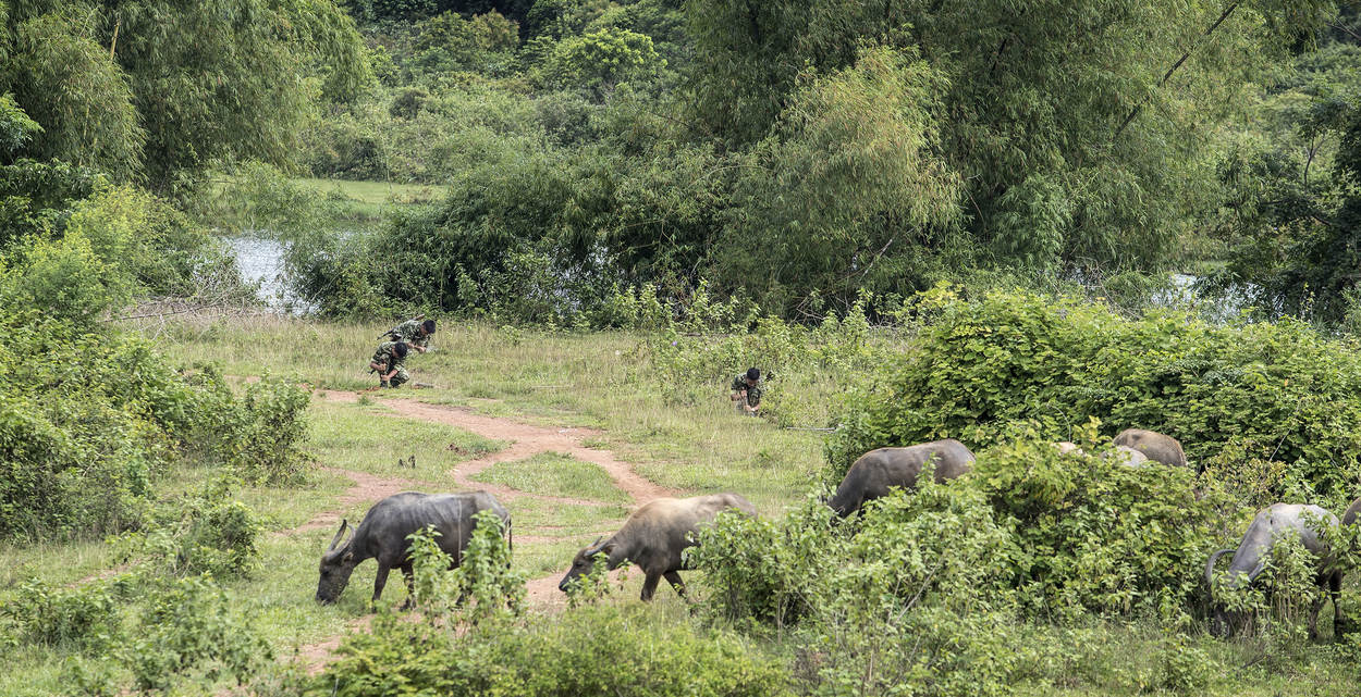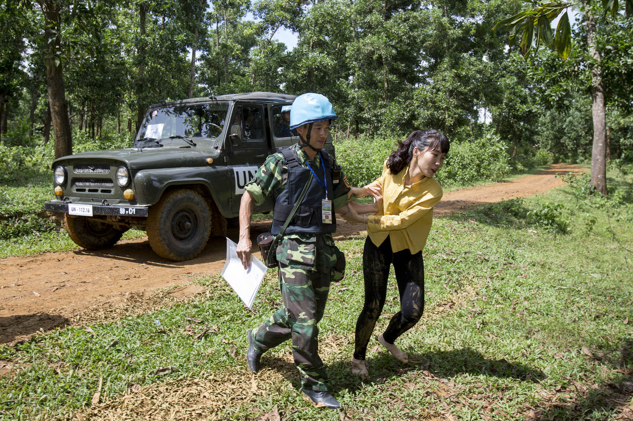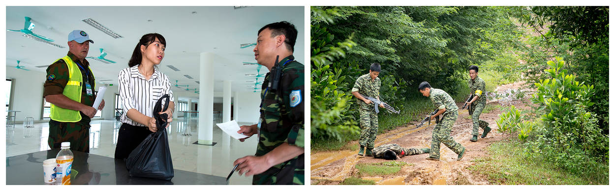 Na een week theorie, trainen de cursisten in de praktijk. Dat gebeurt in de omgeving van het Peacekeeping Training Center. De lokale autoriteiten hebben de militairen toestemming gegeven er te oefenen. Dat is nodig omdat het terrein officieel niet van het Vietnamese Volksleger is. Normaliter lopen er burgers en grazen er koeien. Ook tijdens de cursus trouwens, wat hinderlijk is als je mijnen wilt ingraven op plekken waar het gras juist zo lekker smaakt.