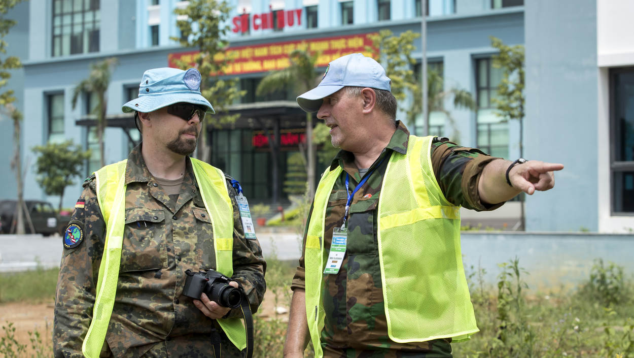 “Deze internationale samenwerking vind ik héél bijzonder”, vertelt sergeant-majoor Ruud Bladergroen in de brandende zon op het Peacekeeping Training Center, een half uurtje rijden van de hoofdstad. “Ik realiseer me dat ik in een bevoorrechte positie zit en deel uitmaak van een unieke gebeurtenis”, vervolgt de onderofficier terwijl hij het zweet uit zijn ogen veegt – de luchtvochtigheid is 91%. 5 meter verderop turen 3 Vietnamese officieren geconcentreerd naar een gat in de grond. Ze analyseren een krater om te achterhalen vanuit welke richting er een mortier is afgevuurd.