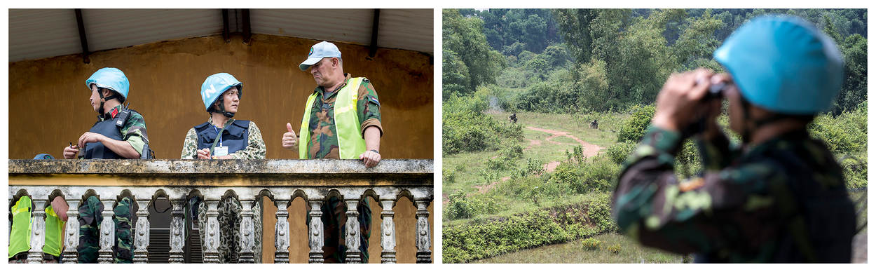“Tango 2, this is Tango Sierra. Radiocheck, over.” 3 Vietnamezen die zojuist met een oude, Russische OeAZ-terreinwagen zijn gearriveerd bij hun tijdelijke observatiepost (OP), worden opgeroepen door de oefenleiding. Radioverbindingen spelen een essentiële rol tijdens de cursus. De OP is gesitueerd op de eerste verdieping van een oud, verweerd gebouw dat uitkijkt op een nog actieve schietbaan, een meer, modderige landweggetjes, een akker en een bos. Het is heet. Het is vochtig. Deze maand valt er meer regen dan in welke andere periode van het jaar ook. Wespen cirkelen hinderlijk rondom de Aziatische blauwhelmen.