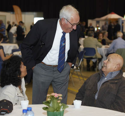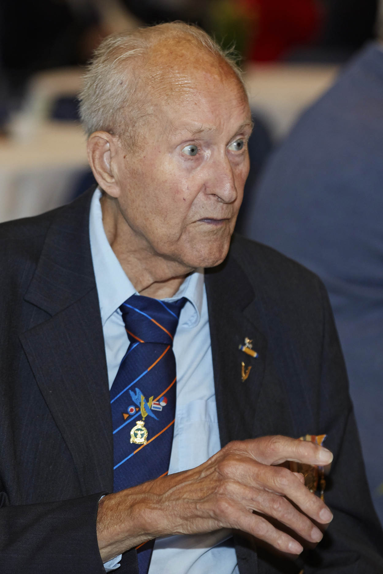 Zo maar een verhaal van een andere luchtmachtveteraan is dat van korporaal 1 b.d. Joop Gadellaa, 95 jaar. Maar wel 1 dat er mag zijn. Hij zit met zijn zoon rustig aan een tafeltje. In 1943 moet hij voor Arbeitseinsatz gedwongen naar Duitsland. “En na een jaar weer terug naar Nederland, want ik had dynamietvergiftiging. Ik werkte in een fabriek van Alfred Nobel. Maar ik was nog geen 2 dagen in Holland en toen werd ik weer opgepakt, samen met een maat van me. We zijn toen op transport gesteld naar Frankrijk. Moesten we gaan werken aan de Atlantikwal. Maar we zijn daar nooit aangekomen, want de trein werd beschoten. Iedereen vloog alle kanten uit en wij zijn ‘m ook gesmeerd. We zaten daar bij een boer ondergedoken totdat de Engelsen en Canadezen ons bevrijden. Ik ging met de Engelsen mee, in uniform. Ik zat in de bediening van de hoge stafofficieren.”
